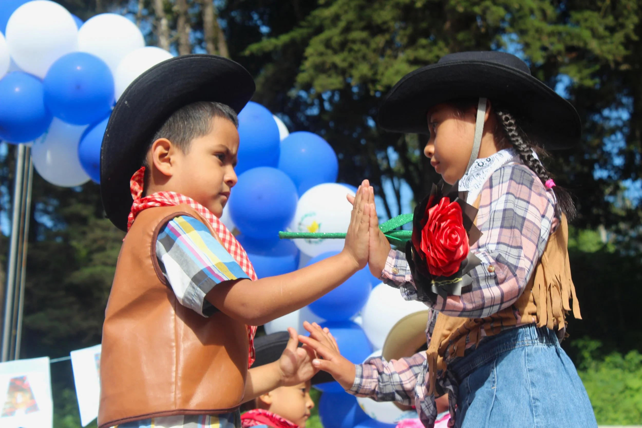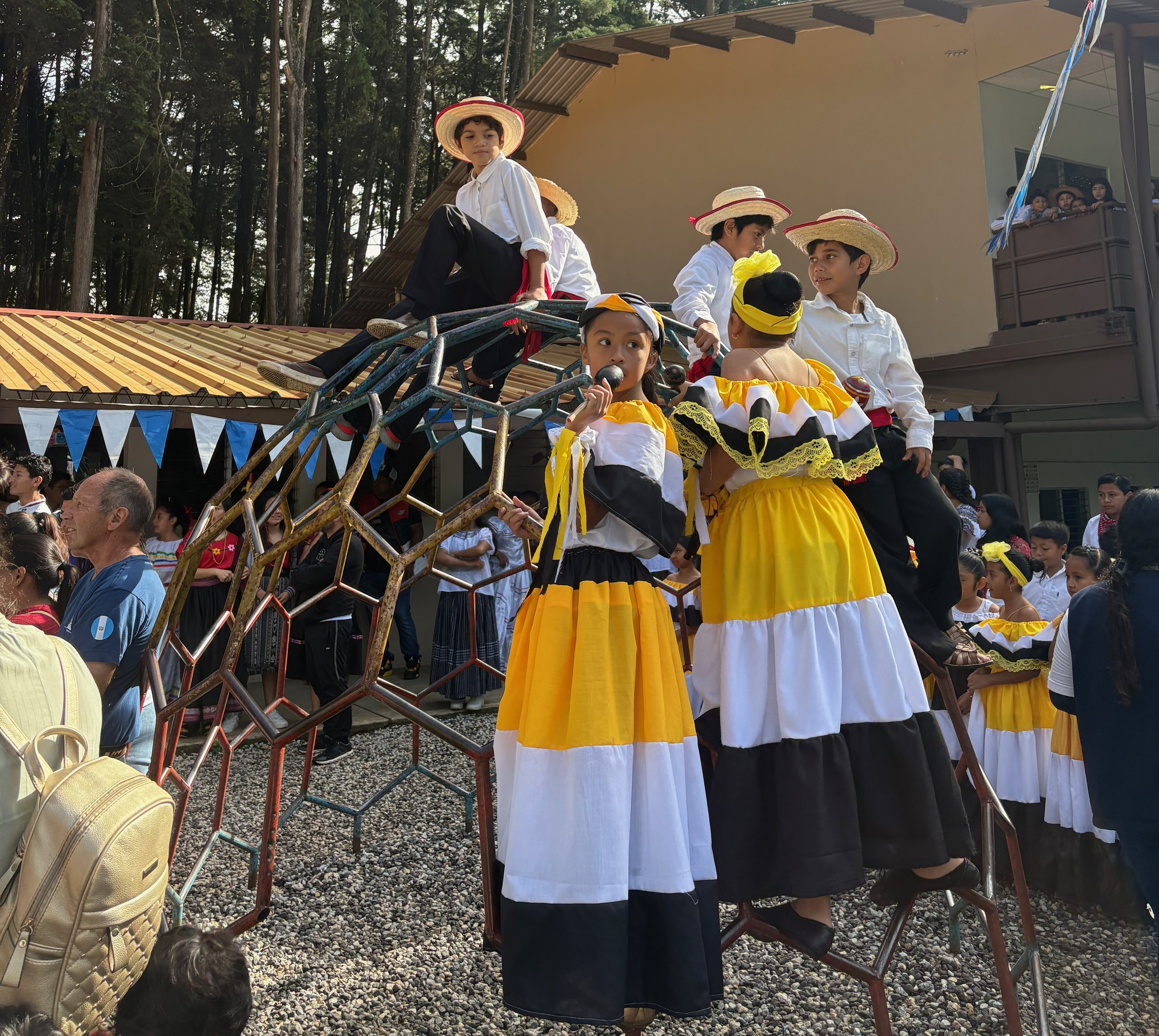 Our celebration was truly a community effort and a labor of love. Every class, from the Pre-K kids to the oldest students, prepared something special. For days beforehand, everyone came together to decorate the campus in blue and white. Our party decorating Vocational Program class built a balloon arch, flags were hung, and routines were practiced. Everyone got dressed up in their traditional Guatemalan clothing, the older girls braided all the younger girls' hair, and the boys donned their straw hats.